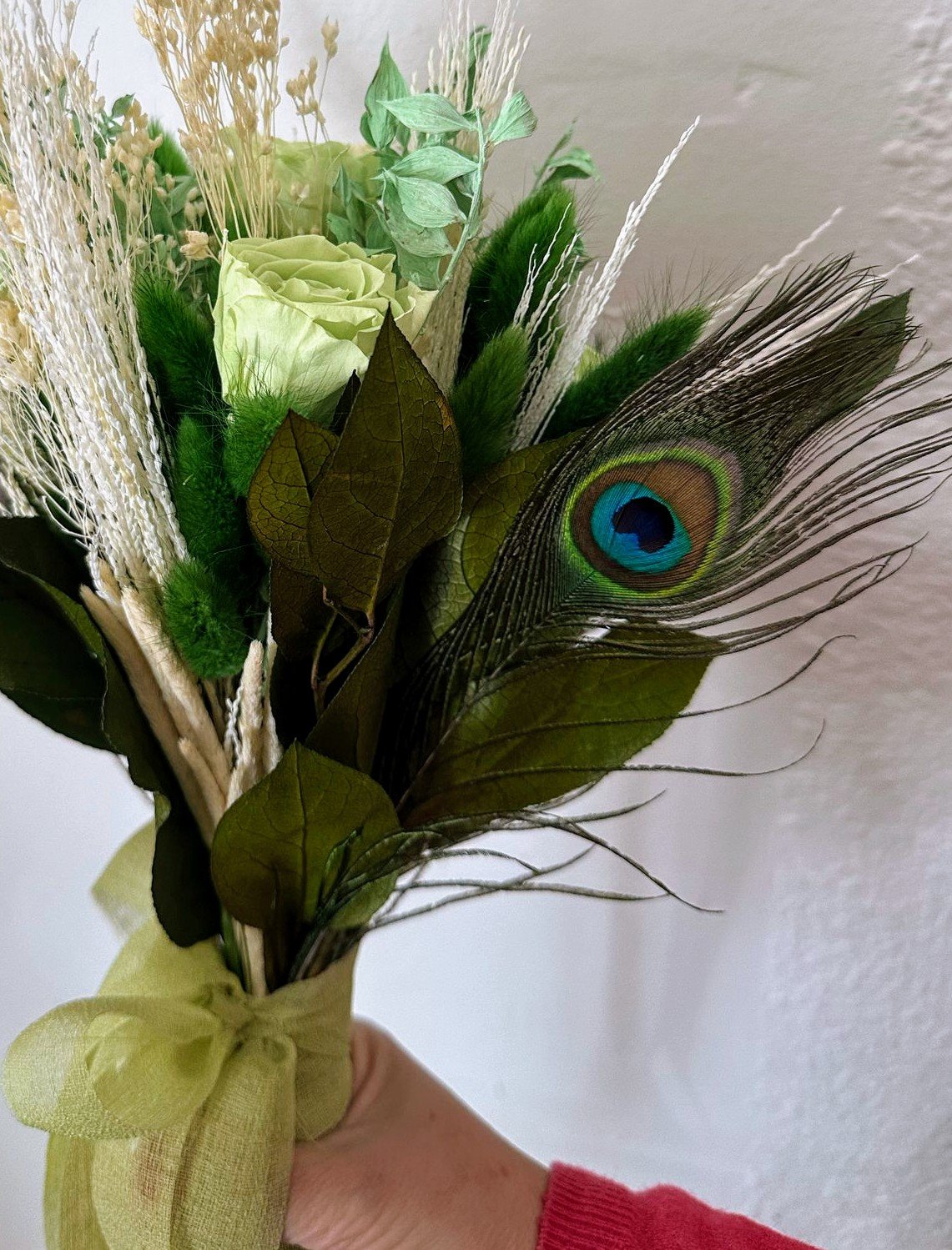 Composición rosa lima green,plumas pavo real,langurus,ruscus,filo,salal y de regalo un prendido basico
